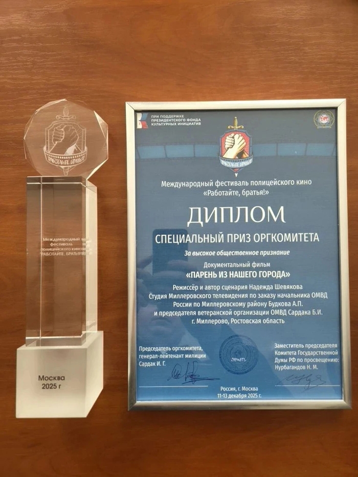 Картина «Парень из нашего города» рассказывает о трагических событиях мая 2002 года, когда оперуполномоченный уголовного розыска погиб при задержании опасного преступника в Тарасовском районе. В основе фильма — воспоминания коллег, очевидцев и жителей, установивших памятный камень в Миллерово.Создатели ленты — творческая группа под руководством режиссёра Н. И. Шевяковой — получили диплом за высокое общественное признание и специальный приз фестиваля, проходившего в Москве при поддержке Фонда президентских культурных инициатив.На встрече в отделе полиции, где чествовали авторов, начальник ОМВД А. П. Будков напомнил: Эдуард Толстых навечно зачислен в списки личного состава и посмертно награждён орденом Мужества.Стеклянная статуэтка фестиваля передана в краеведческий музей — в зал истории полиции.