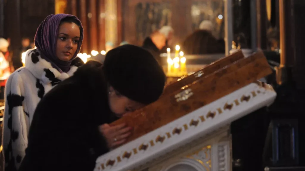 В часовнях, храмах, соборах воскресным вечером уже все по-другому: аналои покрыты темной тканью, а в середине вечерни священники свое светлое облачение меняют на черное. Читается Нагорная проповедь с наставлением о том, прощая ближнего, мы проявляем милосердие и любовь так же, как милует нас Спаситель. По окончании вечерни происходит чин Прощения.